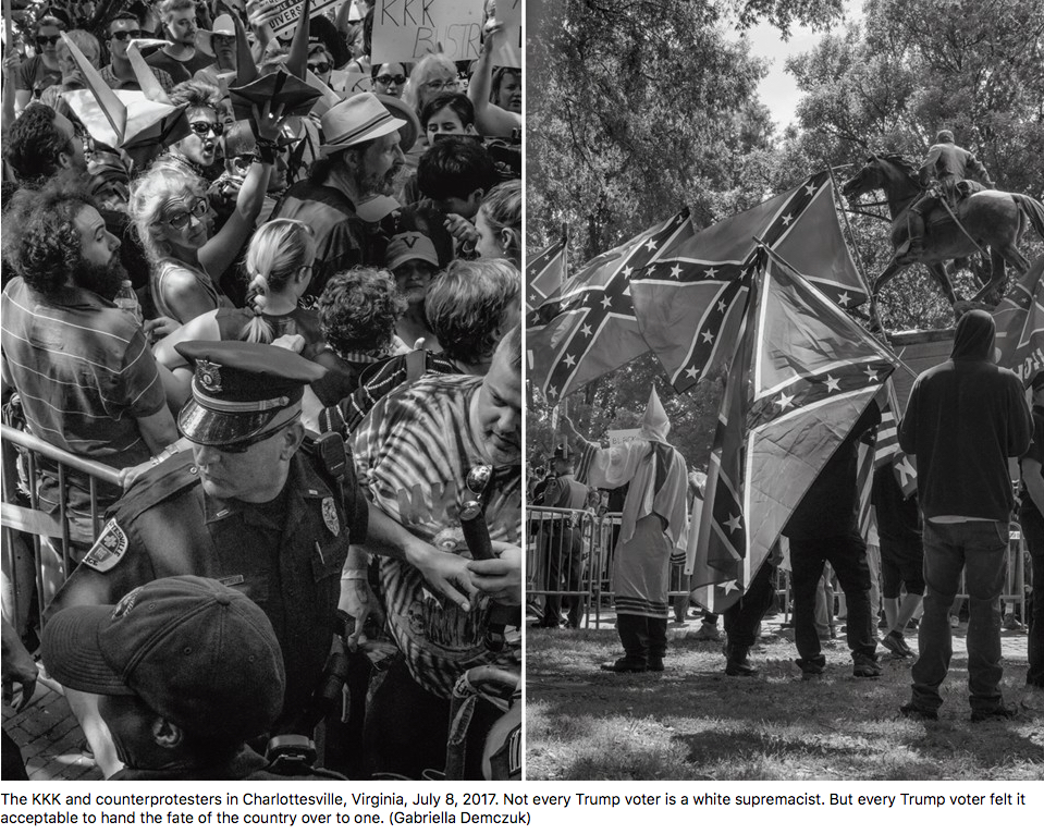In Trump, white supremacists see one of their own. Only grudgingly did Trump denounce the Ku Klux Klan and David Duke, one of its former grand wizards—and after the clashes between white supremacists and counterprotesters in Charlottesville, Virginia, in August, Duke in turn praised Trump’s contentious claim that “both sides” were responsible for the violence.