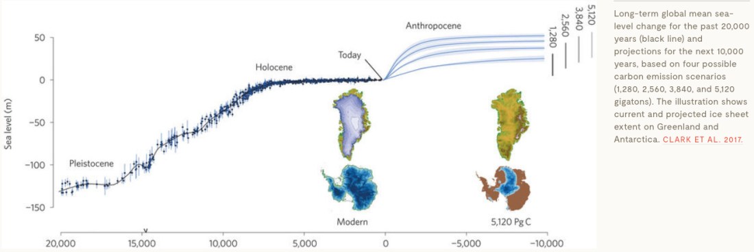 Long-term global mean sea-level change for the past 20,000 years (black line) and projections for the next 10,000 years, based on four possible carbon emission scenarios (1,280, 2,560, 3,840, and 5,120 gigatons). The illustration shows current and projected ice sheet extent on Greenland and Antarctica. CLARK ET AL. 2017.