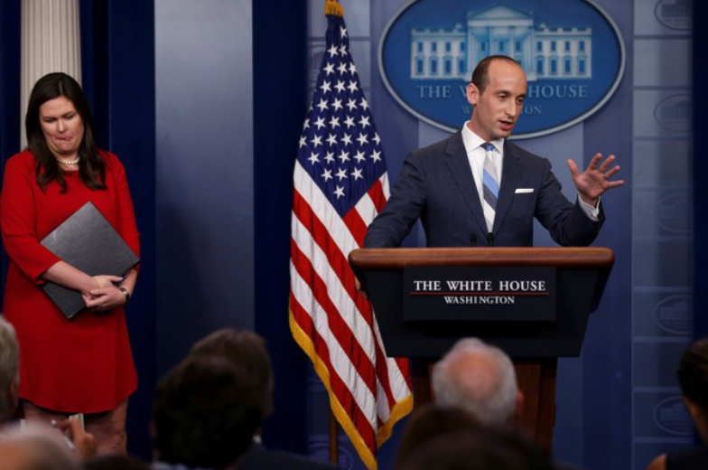 At a White House press briefing in August 2017, Miller accused a CNN reporter of “cosmopolitan bias.” (Jonathan Ernst / Reuters)