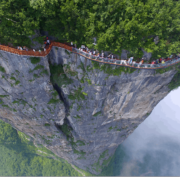 Tianmen Mountain, located in the Hunan Province of China, is around 5,000 feet high, and has a temple at the summit.