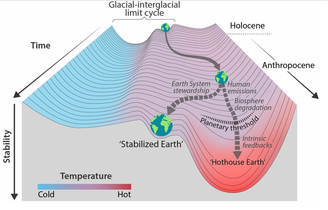 Stability landscape showing the pathway of the Earth System out of the Holocene and thus, out of the glacial–interglacial limit cycle to its present position in the hotter Anthropocene. The fork in the road in Fig. 1 is shown here as the two divergent pathways of the Earth System in the future (broken arrows). Currently, the Earth System is on a Hothouse Earth pathway driven by human emissions of greenhouse gases and biosphere degradation toward a planetary threshold at ∼2 °C (horizontal broken line at 2 °C in Fig. 1), beyond which the system follows an essentially irreversible pathway driven by intrinsic biogeophysical feedbacks. The other pathway leads to Stabilized Earth, a pathway of Earth System stewardship guided by human-created feedbacks to a quasistable, human-maintained basin of attraction. “Stability” (vertical axis) is defined here as the inverse of the potential energy of the system. Systems in a highly stable state (deep valley) have low potential energy, and considerable energy is required to move them out of this stable state. Systems in an unstable state (top of a hill) have high potential energy, and they require only a little additional energy to push them off the hill and down toward a valley of lower potential energy.